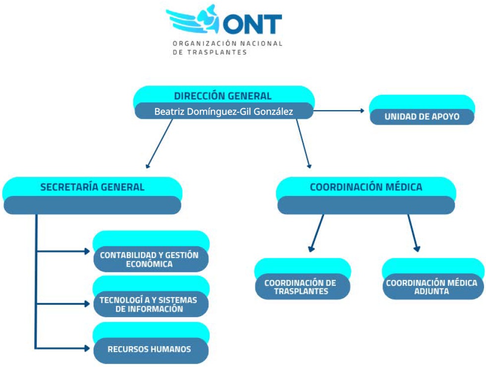 La Organización Nacional de Trasplantes (ONT) se estructura en una Dirección General, de la cual dependen las unidades de Secretaría General y Coordinación Médica.